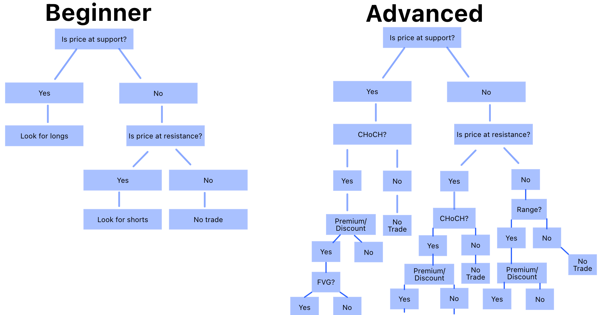 For example, let’s imagine the trading checklist for a beginner trader vs. the trading checklist for an experienced trader: